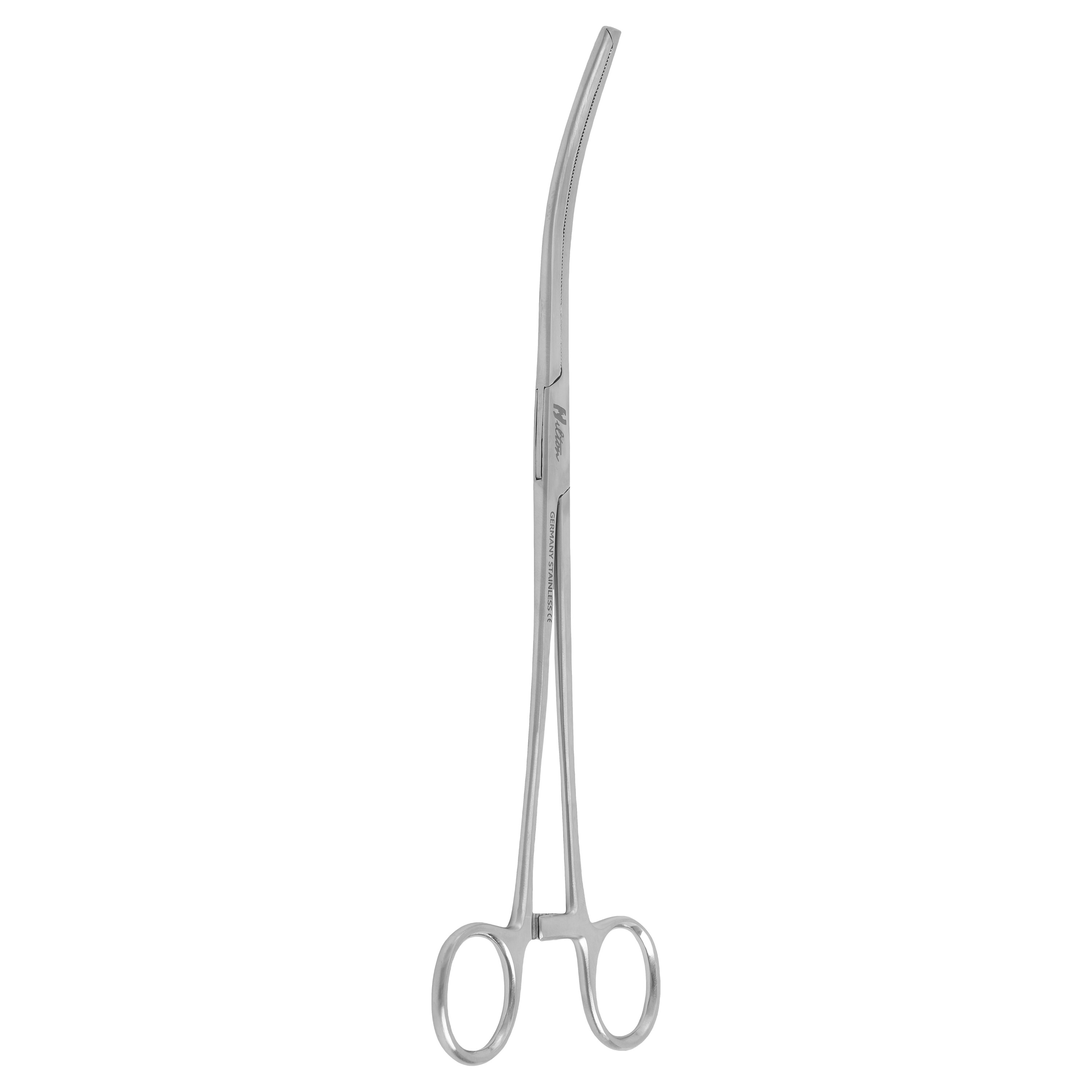 The Hilton Kocher Clamp (25 cm) is a surgical instrument designed for grasping tough tissues and securing bleeding vessels during surgical procedures. It features serrated jaws with a strong grip and a ratchet locking mechanism to hold tissues firmly. Made of high-quality stainless steel, it ensures durability, corrosion resistance, and repeated sterilization.