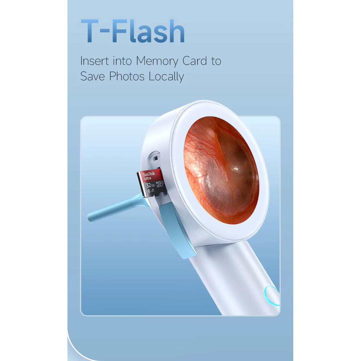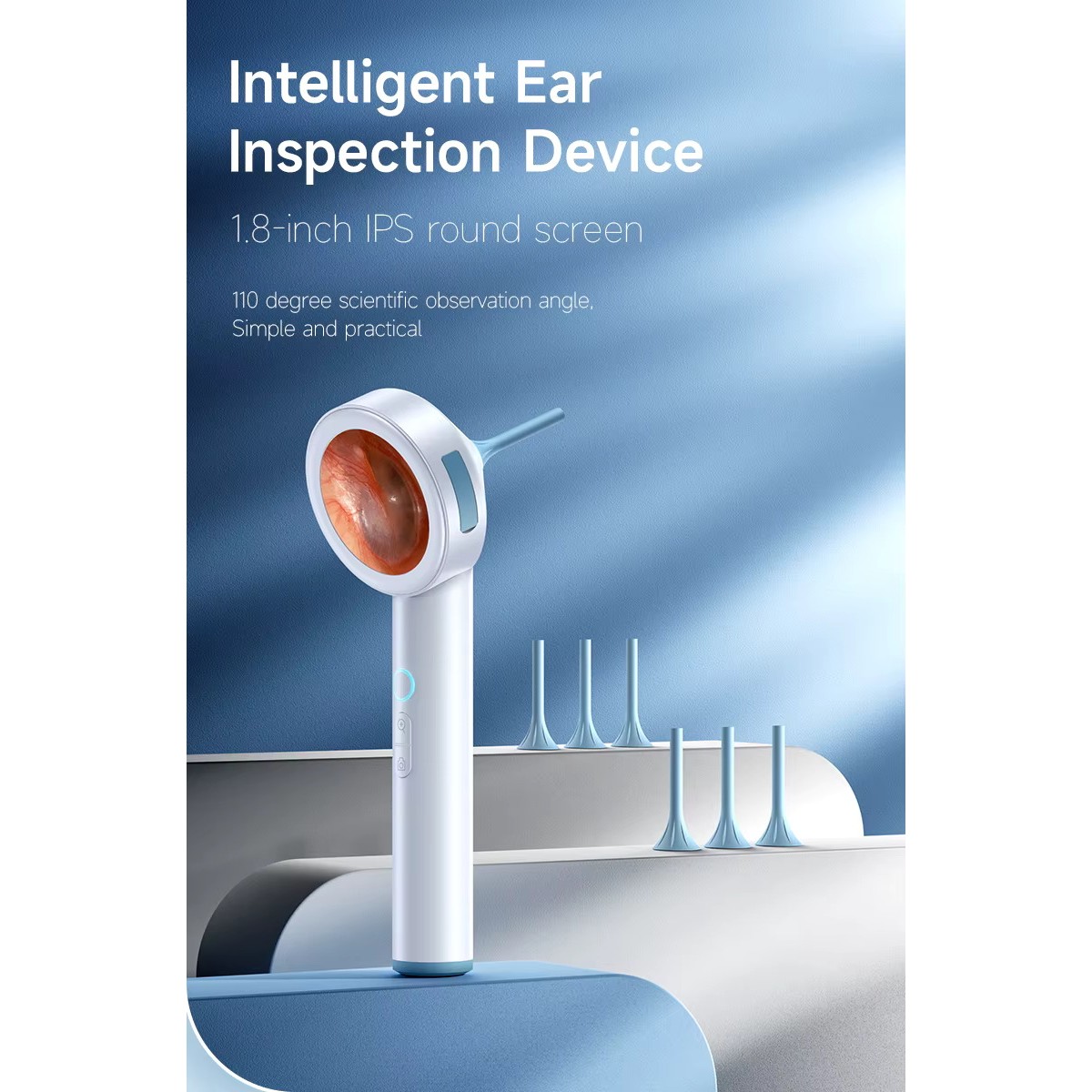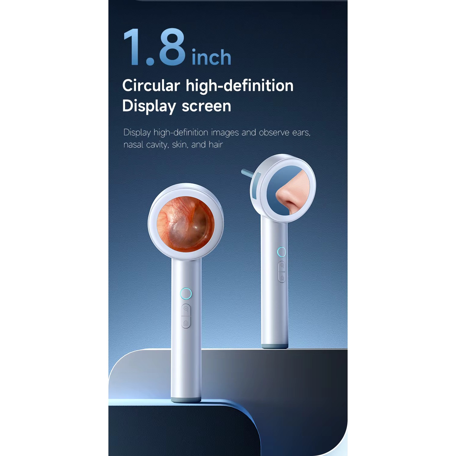 This digital inspection camera is a compact handheld device used for visual examination of ears, nasal cavity, skin, and teeth. It features a 1.8-inch full-angle display that shows real-time images captured by the integrated HD 1080P camera module. The device supports photo and video recording, adjustable light brightness, and zoom functionality, making it suitable for personal or clinical inspection purposes.